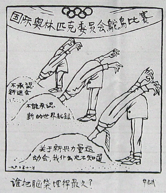 banner at the top reads: "International Olympic Committee ostrich competition"